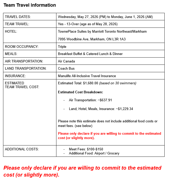 TEAM TRAVEL DATES: Wed, May 27 (PM) to Mon, June 1 (AM)